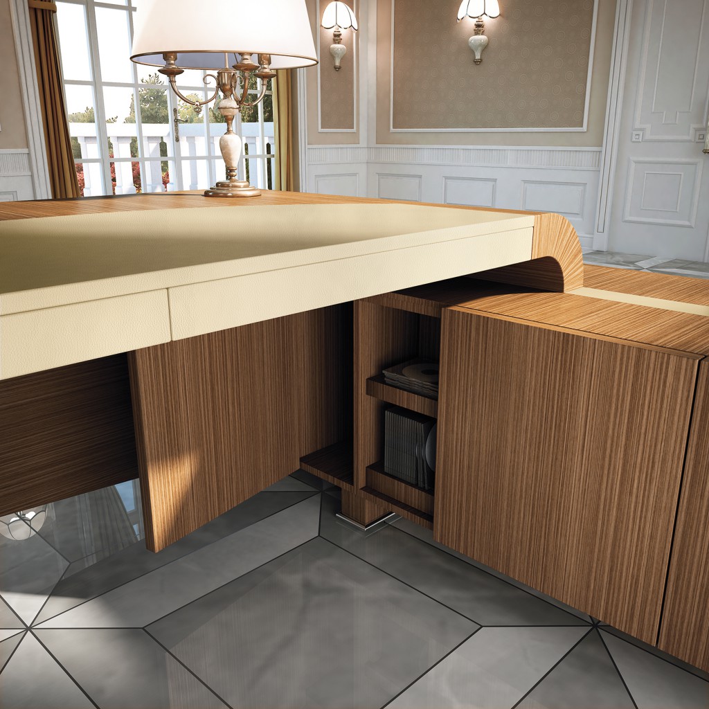 Vanity prestige provides an emotional working set where simple lines, wealthy and combined materials remind of a timeless elegance as a new classicism. Once with rich details and comfort, so to re-discover the pleasure to work with instinct, passion and personality. Wide range of furniture solutions, linear desking, with side and frontal extensions. Meeting and conference tables, chairs, furniture and so on. Walnut, ebony, lacquered and leather are the finishes available. Originality and attention to details practical wardrobe module and secret space with safety box in the side extension to keep secret documents. Vanity is green because it is made with eco friendly materials with low environmental impact according to EC normative. Vanity is available in any RAL colour on request.